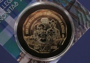 A twenty pesos coin is seen, as Mexico’s Central Bank (Banco de Mexico) puts into circulation a twenty pesos coin which commemorates the 100th anniversary of the arrival of the Mennonites to the country, in this picture illustration taken August 9, 2022. REUTERS/Henry Romero/Illustration