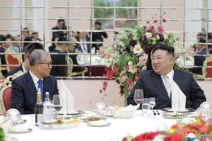 North Korean leader Kim Jong Un speaks with Chinese Communist Party politburo member Li Hongzhong during an event in Pyongyang, North Korea, July 28, 2023, in this image released by North Korea’s Korean Central News Agency. KCNA via REUTERS