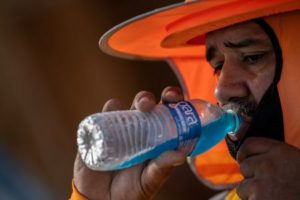 FILE PHOTO: A construction worker drinks a cold beverage during a heat wave where temperatures rise over 110 degrees Fahrenheit for 27 consecutive days, in Scottsdale, at the Phoenix metro area, Arizona, U.S., July 28, 2023. REUTERS/Carlos Barria