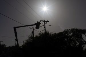 A man with American Electric Power (AEP) repairs an electricity cable during a heatwave in Eagle Pass, Texas, U.S. July 28, 2023. REUTERS/Adrees Latif