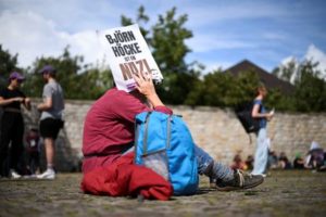 A person uses a placard to cover from the sun as people gather on the day of the European election assembly 2023 of the Alternative for Germany (AfD) in Magdeburg, Germany, July 29, 2023. REUTERS/Annegret Hilse
