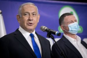 Israeli Prime Minister Benjamin Netanyahu speaks to the media next to Health Minister Yuli Edelstein after his meeting with the Israeli citizen no. 5,000,000 to get the Pfizer-BioNTech coronavirus disease (COVID-19) vaccine, in Tel Aviv, Israel, March 8, 2021. Miriam Alster/Pool via REUTERS/File Photo