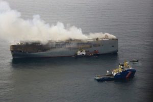 FILE PHOTO: Smoke rises from burning cargo ship Fremantle Highway at sea off the Netherlands, July 28, 2023. Dutch Coastguard/Handout via REUTERS