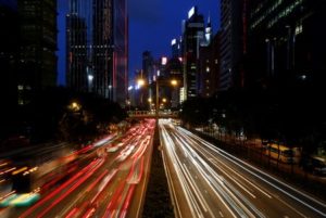 Traffic is seen between office buildings at sunset in downtown Hong Kong, China June 29, 2017. Picture taken June 29, 2017. REUTERS/Bobby Yip/File photo