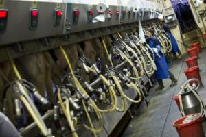 FILE PHOTO: Workers milk cows at a dairy farm that