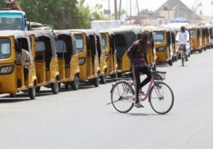 FILE PHOTO: A man crosses the road on his bicycle at a taxi station in Adamawa state capital Yola, Nigeria February 23, 2023. REUTERS/Esa Alexander/File Photo