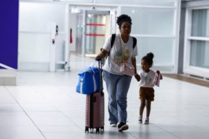 A woman and a child, among the French nationals and other European citizens, who have been evacuated from Niger, days after a junta seized power in the West African country, arrive at the Paris Charles de Gaulle Airport in Roissy, near Paris, France, August 2, 2023. REUTERS/Stephanie Lecocq