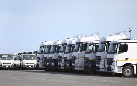 Newly manufactured trucks from a nearby plant are parked before being loaded onto a cargo ship, in East London