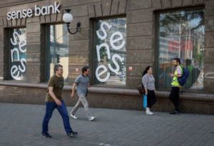 FILE PHOTO: People walk past a branch of Sense Bank, amid Russia’s attack on Ukraine, in central Kyiv, Ukraine June 21, 2023. REUTERS/Gleb Garanich/File Photo