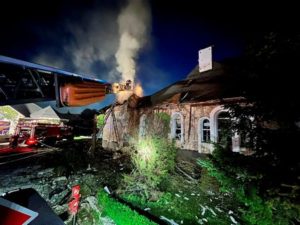 Rescuers work at a site of building damaged in the night by Russian drone strikes, amid Russia’s attack on Ukraine, in Kyiv region, Ukraine August 2, 2023. Press service of the State Emergency Service of Ukraine/Handout via REUTERS