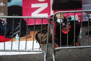 A recently arrived migrant New York City rests on the sidewalk outside the Roosevelt Hotel in midtown, Manhattan, where a temporary reception center has been established in New York City, New York, U.S., August 1, 2023. REUTERS/Mike Segar