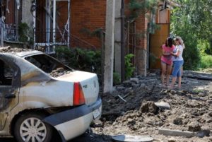 Women stand at the site of a shelling in the course of Russia-Ukraine conflict in Donetsk, Russian-controlled Ukraine, July 31, 2023. REUTERS/Alexander Ermochenko/File Photo