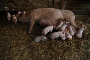 FILE PHOTO: A mother sow nurses her piglets in the farrowing barn at Randy Hutton Jr.’s farm, an independent farm with Niman Ranch, in Chestertown, Maryland, U.S., July 27, 2023. REUTERS/Leah Millis/File Photo