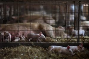 FILE PHOTO: Piglets nap and wander about their stalls between nursings in the farrowing barn at Randy Hutton Jr.’s farm, which is an independent farm with Niman Ranch in Chestertown, Maryland, U.S., July 27, 2023. REUTERS/Leah Millis/File Photo