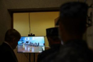 FILE PHOTO: People look at a screen during a video link to an external hearing of the Moscow City Court in a new criminal case against Russian opposition politician Alexei Navalny on numerous charges, including the creation of an extremist organization, at the IK-6 penal colony in the Vladimir region, Russia, June 19, 2023. REUTERS/Evgenia Novozhenina/File Photo