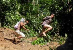 FILE PHOTO: A Ka’apor Indian warrior (L) chases a logger who tried to escape after he was captured during a jungle expedition to search for and expel loggers from the Alto Turiacu Indian territory, near the Centro do Guilherme municipality in the northeast of Maranhao state in the Amazon basin, August 7, 2014. REUTERS/Lunae Parracho/File Photo