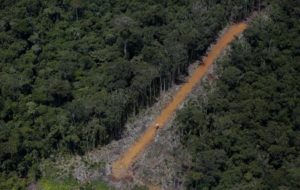 FILE PHOTO: A helicopter patrols an illegal lane used by miners during Brazil’s environmental agency operation against illegal gold mining on indigenous land, in the heart of the Amazon rainforest, in Roraima state, Brazil April 17, 2016. At over 9.5 million hectares, the Yanomami territory is twice the size of Switzerland and home to around 27,000 Indians. The land has legally belonged to the Yanomami since 1992, but illegal miners continue to plague the area, sawing down trees and poisoning rivers with mercury in their lust for gold. REUTERS/Bruno Kelly/File Photo