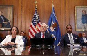 U.S. Attorney General Merrick Garland is flanked by Deputy Attorney General Lisa O. Monaco and Assistant Attorney General Kenneth Polite of the Justice Department’s Criminal Division as he meets with his deputies and U.S. attorneys from across the country to discuss crime reduction strategies during a meeting at Justice Department headquarters in Washington, U.S. June 14, 2023. REUTERS/Tom Brenner/File Photo