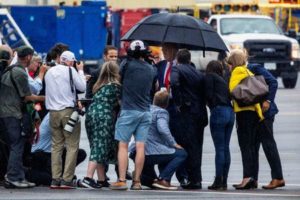 Former U.S. President Donald Trump, who was arraigned on federal charges related to attempts to overturn his 2020 election defeat, faces reporters as he departs Washington at Reagan Washington National Airport in nearby Arlington, Virginia, U.S., August 3, 2023. REUTERS/Amanda Andrade Rhoades