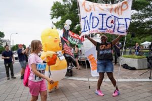 A demonstrator holds a banner, while standing near a person wearing a Baby Trump costume, as people gather on the day former U.S. President Donald Trump, who is facing federal charges related to attempts to overturn his 2020 election defeat, appears at the U.S. District Court in Washington, U.S., August 3, 2023. REUTERS/Sarah Silbiger
