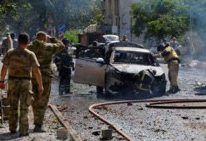 FILE PHOTO: Emergencies services members work at the site of a shelling in the course of Russia-Ukraine conflict in Donetsk, Russian-controlled Ukraine, July 31, 2023. REUTERS/Alexander Ermochenko