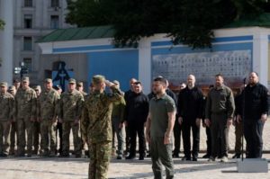 Ukraine’s President Volodymyr Zelenskiy awards a Ukrainian service member during a ceremony marking the Day of Ukrainian Statehood, amid Russia’s attack on Ukraine, in Kyiv, Ukraine July 28, 2023. Ukrainian Presidential Press Service/Handout via REUTERS/File Photo