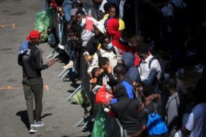 FILE PHOTO: Recently arrived migrants to New York City wait on the sidewalk outside the Roosevelt Hotel in midtown, Manhattan, where a temporary reception center has been established in New York City, New York, U.S., August 1, 2023. REUTERS/Mike Segar/File Photo