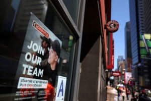 FILE PHOTO: A sign for hire is posted on the window of a restaurant in New York City, U.S., April 29, 2022. REUTERS/Shannon Stapleton/File Photo