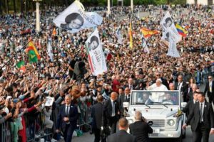 Pope Francis waves as he meets with people at the Chapel of Apparitions of the Shrine of Our Lady of Fatima, during his apostolic journey to Portugal on the occasion of the XXXVII World Youth Day, in Fatima, Portugal, August 5, 2023. Vatican Media/ÂHandout via REUTERS