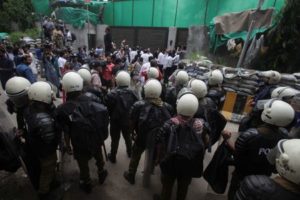 Police officers and members of the media gather following the arrest of Pakistan’s former Prime Minister Imran Khan, outside his residence in Lahore, Pakistan August 5, 2023. REUTERS/Mohsin Raza