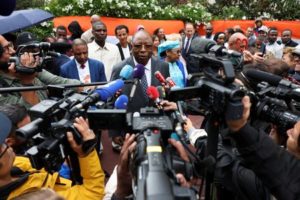 Niger’s Prime Minister Ouhoumoudou Mahamadou speaks to the media as he joins demonstrators outside Niger’s embassy to support Niger’s President Mohamed Bazoum, in Paris, France, August 5, 2023. REUTERS/Stephanie Lecocq