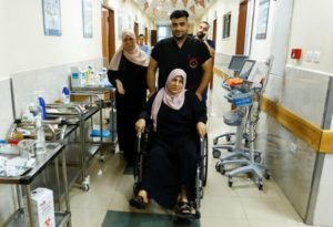 Palestinian patient Halima Abu Hayya sits in a wheelchair after she had a joint replacement surgery, at Nasser Medical Complex, during a visit of U.S. surgeons in Gaza for a vital medical intervention, in Khan Younis, southern Gaza Strip August 6, 2023. REUTERS/Ibraheem Abu Mustafa