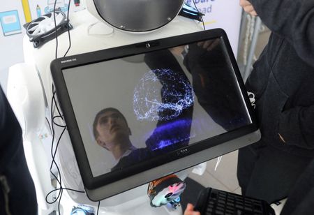 FILE PHOTO: High school student Richard Erkhov is reflected on a screen of "Alnstein", a robot powered with ChatGPT, in Pascal school in Nicosia