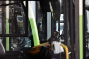 FILE PHOTO: Signage requiring mask use is seen inside Proterra Catalyst BE35 electric buses parked at an L.A. City Transportation Department (LADOT) DASH transit bus maintenance facility in downtown Los Angeles, California, U.S., August 21, 2021. REUTERS/Bing Guan/file photo