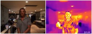 An unhoused man poses for a picture inside a cooling station during a 27 days long heat wave with temperatures over 110 degrees Fahrenheit (43 degrees Celsius), near downtown in Phoenix, Arizona, U.S., July 26, 2023. On July 26 at 15:34 (GMT-7), a Flir One ProThermal camera registered a surface temperature of 88?F (31?C), with an air temperature of 97?F (36?C) according to the National Weather Service. REUTERS/Carlos Barria