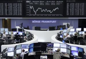 Traders are pictured at their desks in front of the DAX board at the stock exchange in Frankfurt, Germany July 29, 2015. REUTERS/Remote/Pawel Kopczynski/File Photo