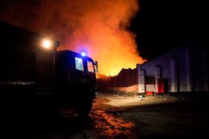 A fire truck is seen at a site of a fire in the aftermath of an attack, amid Russia’s attack on Ukraine, given as Starokostiantyniv, Khmelnytskyi Region, Ukraine, in this handout photo released on August 6, 2023, courtesy of the Khmelnytskyi region administration/Handout via REUTERS