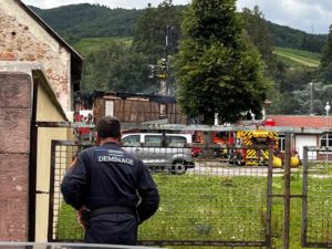 The remnants of a holiday home is seen in eastern France near Colmar where disabled people were killed as fire broke out during their summer holidays in Wintzenheim, August 9, 2023. REUTERS/Tilman Blasshofer