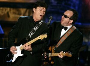 FILE PHOTO: Musicians Robbie Robertson and Elvis Costello perform during an all-star tribute to New Orleans at the end of the 2006 Rock and Roll Hall of Fame induction ceremonies at the Waldorf Astoria Hotel in New York, U.S., March 13, 2006. REUTERS/Mike Segar/File Photo