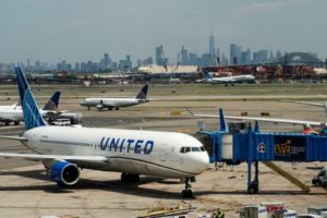 FILE PHOTO: The One World trace Center and the New York skyline are seen while United Airlines planes use the tarmac as pilots from United Airlines take part in an informational picket at Newark Liberty International Airport in Newark, New Jersey, U.S., May 12, 2023. REUTERS/Eduardo Munoz/File Photo