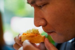 A man smells lab-grown meat served by CellX at an event to mark the opening of the cultivated meat company’s pilot production facility in Shanghai, China August 9, 2023. REUTERS/Aly Song