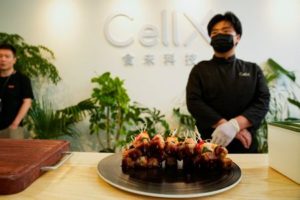 Lab-grown meat is seen on a plate served by CellX at an event to mark the opening of the cultivated meat company’s pilot production facility in Shanghai, China August 9, 2023. REUTERS/Aly Song