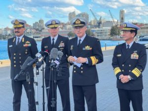 Vice admiral Saito Akira Commander in Chief of Japan Self Defense Fleet, Rear Admiral Christopher Smith, Commander Australian Fleet, Vice Admiral Dinesh Tripathi Commanding in Chief of India’s Western Naval Command, and Vice Admiral Karl Thomas, Commander of the U.S. 7th Fleet attend to media as India, Japan, US, Australia will hold first Malabar naval exercise off Australia, in Sydney, Australia, August 10, 2023. REUTERS/Kirsty Needham