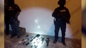Police officers stand next to seized firearms, in the aftermath of the killing of Ecuadorean presidential candidate Fernando Villavicencio, in a location given as Quito, Ecuador in this screen grab from a video released on August 10, 2023. Policia Nacional de Ecuador/Handout via REUTERS