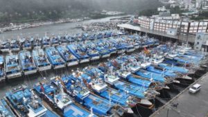 Fishing boats are anchored as they evacuate from typhoon Khanun at a port in Seogwipo on Jeju island, South Korea, August 9, 2023. Yonhap via REUTERS
