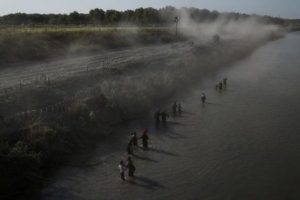 The Heavenly Farms pecan orchard is seen in the background as dust rises over migrants wading the Rio Grande river while searching for an entry point into the United States from Mexico in Eagle Pass, Texas, U.S. July 30, 2023. REUTERS/Adrees Latif