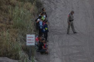 A Texas Department of Public Safety (DPS) trooper stands guard as migrant families surrender after crossing the Rio Grande river into the United States from Mexico in Eagle Pass, Texas, U.S. July 29, 2023. REUTERS/Adrees Latif