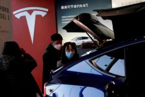 FILE PHOTO: Visitors wearing face masks check a China-made Tesla Model Y sport utility vehicle (SUV) at the electric vehicle maker’s showroom in Beijing, China January 5, 2021. REUTERS/Tingshu Wang//File Photo