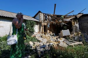 FILE PHOTO: Lyubov Tolchina, 63, reacts next to the damaged house of her son Vitaly, 40, who was killed the day before by shelling in the course of Russia-Ukraine conflict in Donetsk, Russian-controlled Ukraine, August 13, 2023. REUTERS/Alexander Ermochenko/File Photo