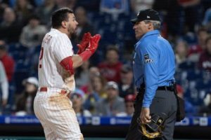 Apr 24, 2022; Philadelphia, Pennsylvania, USA; Philadelphia Phillies designated hitter Kyle Schwarber (12) argues with umpire Angel Hernandez after being called out on strikes during the ninth inning against the Milwaukee Brewers at Citizens Bank Park. / Bill Streicher-USA TODAY Sports/File Photo